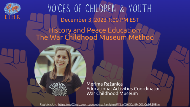 Merima Raลพanica, koordinatorica edukativnih aktivnosti Muzeja ratnog djetinjstva, ove je nedjelje odrลพala webinar namijenjen edukatorima i edukatoricama ลกirom svijeta, na temu โGlasovi djece i mladihโ. Predavanje je odrลพano u sklopu serije webinara koja se tiฤu pitanja historije i mirovnog obrazovanja, a koju organizira meฤunarodni Institut edukatora i edukatorica za ljudska prava.