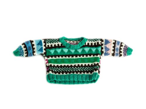 I knitted this sweater for my teddy bear whom I carried with me everywhere. Everyone gave me some of their yarn, which came in various colors, so the sweater I knitted turned out colorful. The front, the back, and the sleeves are in many different shades. I kept it to this day, so that I could have one wonderful memory amid all the bad ones – it would remind me that I, a child living in those conditions, learned a valuable skill.